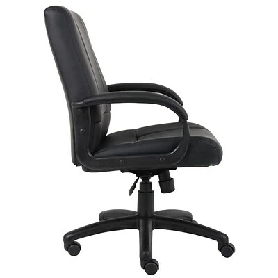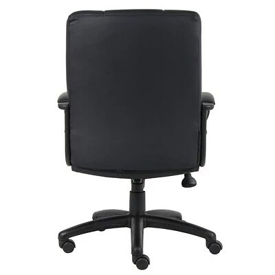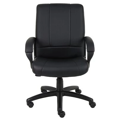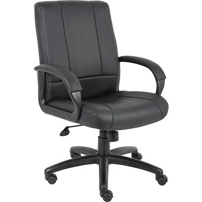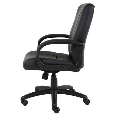 This executive mid back chair is elegantly upholstered with extremely soft and durable Caressoft leather. It features integrated lumbar support and padded armrests decorated in comfortable CaressoftPlus upholstery. Additional features include an upright locking position, adjustable tilt tension control, and pneumatic gas lift seat height adjustment for a seat height that extends from 20-inch to 23.5-inch. All of this sits atop a sturdy 27-inch nylon base with five hooded double wheel casters for exemplary stability and maximum mobility.
