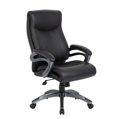 When it comes to comfort, our double layer executive chair will make sure you never settle for second best. It is elegantly upholstered in black Leather Plus, a comfortable combination of leather and polyurethane that provides softness and durability. In addition to its padded armrests and gun metal finish, it features pneumatic gas lift seat height adjustment and adjustable tilt tension control. All of this rests atop a large 27” nylon base with five hooded double wheel casters.