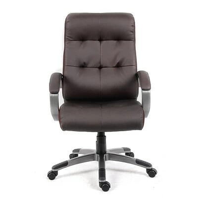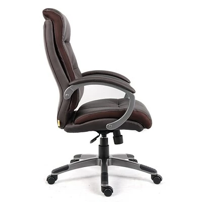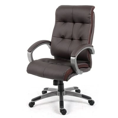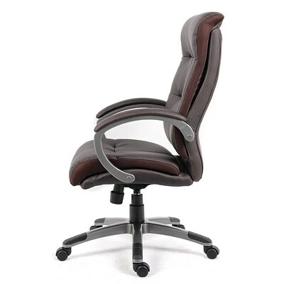 This double plush, high back executive chair is beautifully upholstered in soft and durable, brown Leather Plus. The arms and base feature a contemporary pewter finish. Comes with pneumatic seat height adjustment and adjustable tilt tension control, and has cushions that are accented with ventilated mesh side panels.