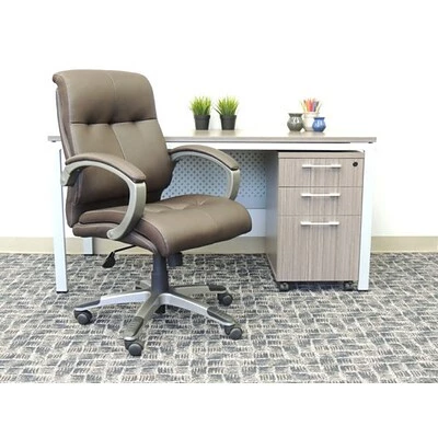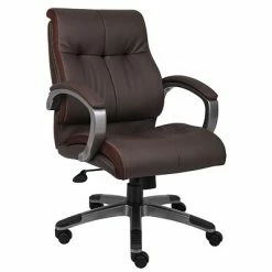 This double plush, mid back executive chair is beautifully upholstered in soft and durable, brown Leather Plus. The arms and base feature a contemporary pewter finish. Comes with pneumatic seat height adjustment and adjustable tilt tension control, and has cushions that are accented with ventilated mesh side panels.