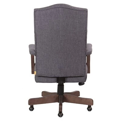 When it comes to class and style the executive commercial grade linen chair in slate grey with driftwood finish frame is top of the line. The chair boasts a sturdy 27 inch traditional driftwood base with hooded brass castors for an elegant look, with a smooth roll. The padded arms are set at a fixed height and the chair utilizes a spring tilt mechanism. In addition to this, the chair also offers tilt tension, a pneumatic gas lift for easy height adjustability and an upright lock.