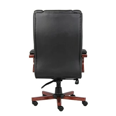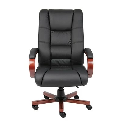 Our high back executive chair features a beautiful classic wood design and is elegantly upholstered in breathable Caressoft upholstery. It features plush Dacron-filled top cushions with perforated centers, mahogany finished wood, and a heavy duty dual paddle spring tilt mechanism with infinite lock. There’s also an adjustable tilt tension control and pneumatic gas lift seat height adjustment. All of this rests atop a sturdy 27-inch nylon base with five hooded double wheel casters for optimal mobility.