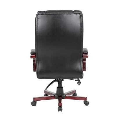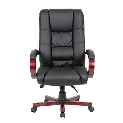 Our high back executive chair features a beautiful classic wood design and is elegantly upholstered in breathable Caressoft upholstery. It features plush Dacron-filled top cushions with perforated centers, mahogany finished wood, and a heavy duty dual paddle spring tilt mechanism with infinite lock. Thereโs also an adjustable tilt tension control and pneumatic gas lift seat height adjustment. All of this rests atop a sturdy 27-inch nylon base with five hooded double wheel casters for optimal mobility.