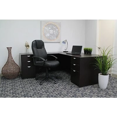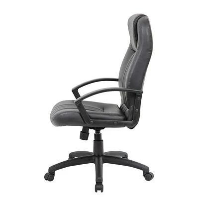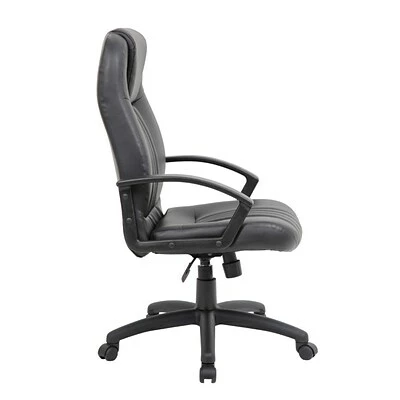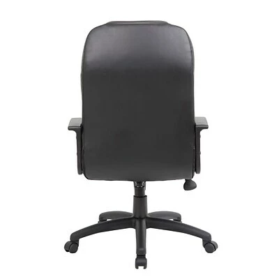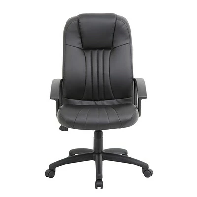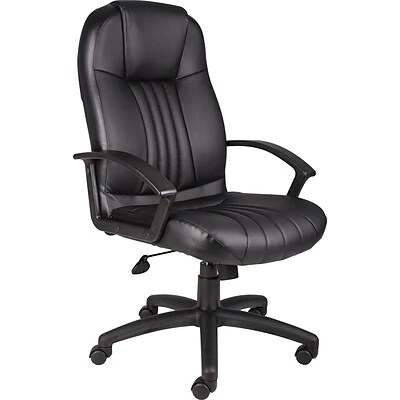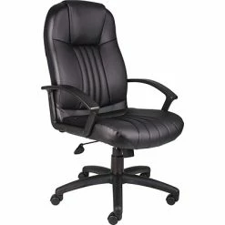 This executive LeatherPlus chair is beautifully upholstered with black LeatherPlus, a combination of leather and polyurethane thatโs as soft as it is durable. It features passive ergonomic seating with integrated lumbar support, durable polypropylene arms, an upright locking position, adjustable tilt tension control, and pneumatic gas lift seat height adjustment for a seat height that extends from 19-inch to 22-inch. All of this sits atop a sturdy 27-inch nylon base with five hooded double wheel casters.