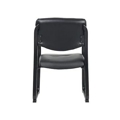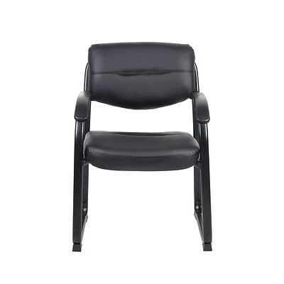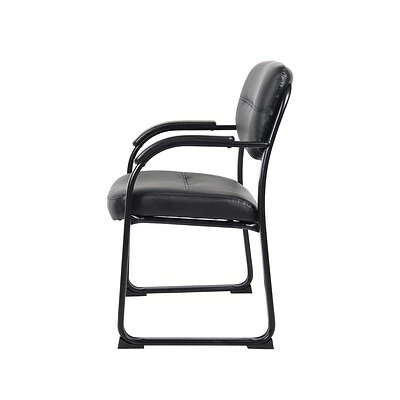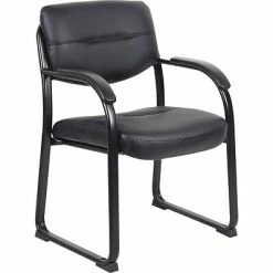 This beautiful guest chair is elegantly upholstered in Black LeatherPlus for comfort and durability. It has padded armrests which provide an extra layer of comfort, while its polished tubular steel frame and black powder coated finish promote a stylish aesthetic that’s as sturdy as it is eye-catching. Additional features include thick contoured cushions, curved arms that easily clear front edges when the chair pulled close to a table, and a contoured seat that provides efficient lumbar support.