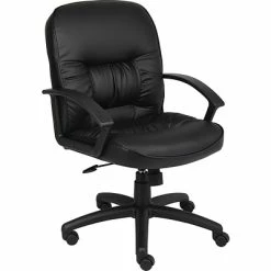 This mid back chair is made with an upholstery material called LeatherPlus, which is a leather infused with polyurethane and boast a sturdy 27 inch nylon base with 2 inch nylon dual wheel castors. The chair also offers a spring tilt mechanism which allows one to change the angle of the entire seat relative to the floor and allows one to transfer some of the upper body weight to the backrest of the chair. In addition to the spring tilt mechanism the chair also offers tilt tension, a pneumatic gas lift for an easily adjustable height and an upright lock.