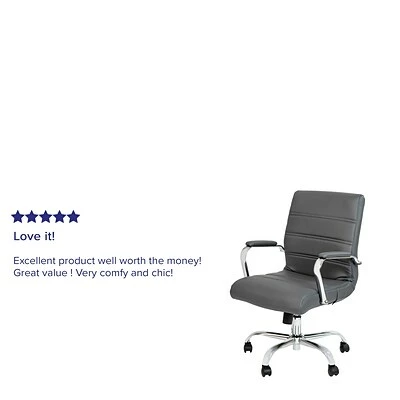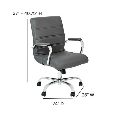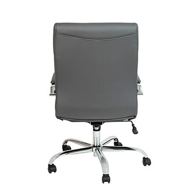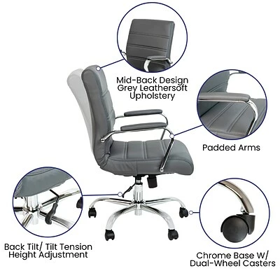 Toss out that old and boring office chair that you’ve had for years because it’s time for an upgrade with this sleek mid-back LeatherSoft office chair. Upholstered in soft and durable LeatherSoft upholstery and paired with chrome finishing help construct this modern office chair. Designed with your comfort in mind, this ergonomic desk chair features ample padding to get you through an 8-hour workday. With its adjustable features, you can lean back while you take a quick phone call or lock in an upright position when it’s time to focus. The knob located underneath the seat adjusts the force needed to recline. Improve the look at your desk or work area with this stylish Mid-Back Gray LeatherSoft Office Chair with Chrome Base that is highlighted by attractive horizontal line stitching. A pressure-reducing waterfall front edge seat and armrest pads round out the look and comfort of this chair.