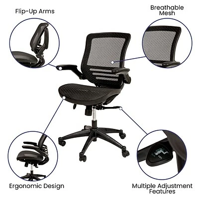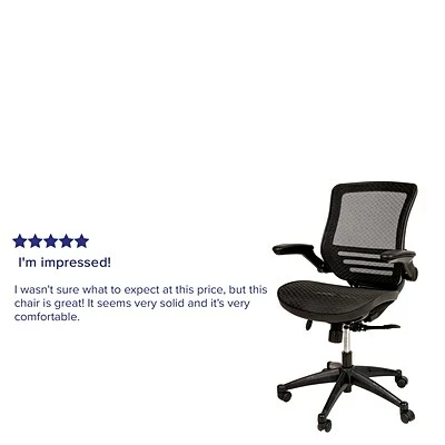 This office chair flawlessly blends form and function to help you through your day. The transparent, breathable mesh material allows air to circulate to keep you cool and more productive. This mesh office chair features a contoured backrest. The synchro tilt control allows this chair’s back and seat to recline at different rates, increasing the angle between your torso and thighs. The waterfall front seat edge removes pressure from the lower legs. Chair easily swivels 360 degrees. The pneumatic adjustment lever will allow you to adjust the seat to your desired height. Padded armrests take pressure off your shoulders and neck, and flip-up and out of the way. If you need to move from one work surface to another, the heavy duty nylon base and dual wheel casters will make it feel effortless. Spills clean up easily with a solvent based cleaner, no water required.