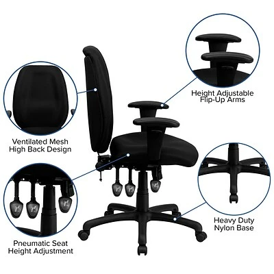 Three paddles located under the seat adjust the height of the back and the seat as well as the angle of the back; the paddles are easy to reach to permit fast adjustments from a seated position. Cushioned T-shape armrests can be adjusted by fingertip controls to reduce fatigue. The seat and back of the Flash Furniture high-back fabric task chair can be simultaneously locked in place for safety.