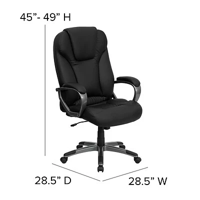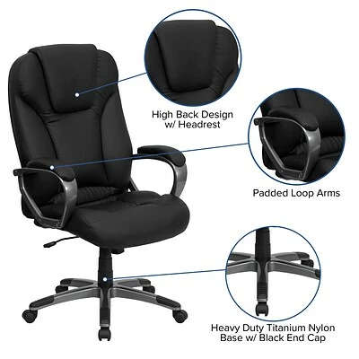 Pull up to your desk each morning in this Flash Furniture LeatherSoft high-back executive office chair. A waterfall seat design promotes better circulation throughout the day, while the taller back with a built-in headrest offers more support for your whole body. With 360-degree swivel action, this executive chair lets you transition from your computer screen to clients effortlessly. Use the tilt tension adjustment knob and tilt lock to find the perfect angle for sitting and move the seat up and down with the pneumatic seat height adjustment feature. This Flash Furniture high-back executive office chair boasts padded loop arms, so you can rest your shoulders, arms and hands in between client calls and email blasts.