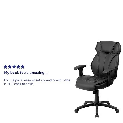 With thick foam padding in the seat, back and headrest, the Flash Furniture high-back executive chair with adjustable arms is built for comfort. Adjust seat height with the user-friendly pneumatic mechanism. Tilt the chair back into the desired position and lock it into place for secure reclined seating. Users can also move the armrests up or down for customized support.