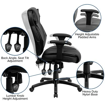 Get the support you need to power through long meetings and tackle big projects with this Flash Furniture executive office chair. Sumptuous LeatherSoft upholstery delivers a rich, upscale look, while the simple, modern silhouette gives your work area a quick style upgrade. Featuring a built-in lumbar support control knob, this desk chair lets you adjust the level of support you need to help relieve tired and strained muscles. Three convenient paddle mechanisms make it easy to change the seat height, tilt angle and back angle for a customized seating configuration. With padded segmented cushions throughout, this Flash Furniture executive office chair offers whole-body comfort.