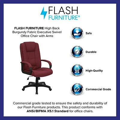 Increase productivity at your workplace with the burgundy Flash Furniture Contemporary Executive Chair that is ergonomically designed to provide comfort while working. Furnished with high-quality fabric upholstery, this high-back executive chair adds a fresh look to your workspace. Its pneumatic seat height adjustment mechanism lets you alter the height to attain a comfortable posture. You can change the back angle with the help of the spring tilt mechanism that enables you to recline while reading or working.