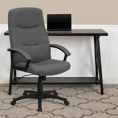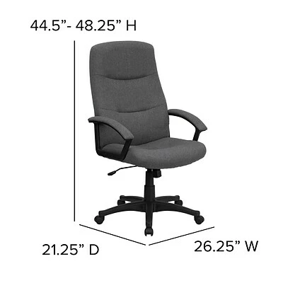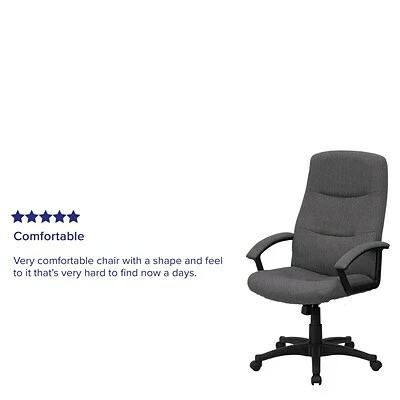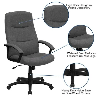 Flash Furniture High back gray fabric executive swivel office chair allows pneumatic seat height adjustment while featuring tilt tension and locking tilt control for added comfort.