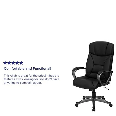 A soft texture with excellent strength provides users of this Flash Furniture LeatherSoft high-back executive chair with optimal comfort during work. It tilts back and includes a tension adjustor to set it to each worker’s preference or to lock it upright when they need to focus on work. This Flash Furniture black executive chair extends all the way up the back for superior support.