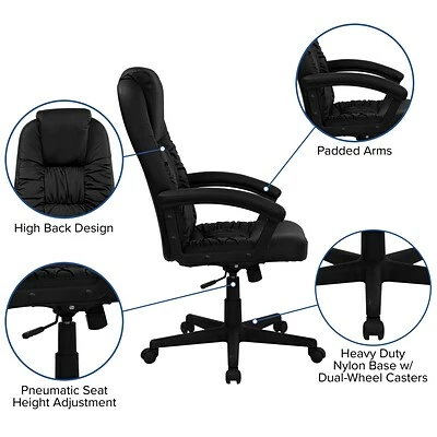 If working long hours is part of your daily routine, the Flash Furniture high-back leather executive swivel office chair may be the perfect chair for you. Just about every aspect of the chair is customizable to ensure that you have the right fit to suit your specific needs. Adjust the height and tilt of the chair back to whatever position feels best to you, and the sturdy five-point base provides maximum stability.