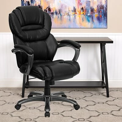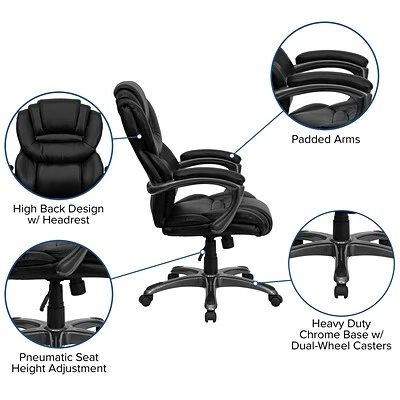 LeatherSoft upholstery gives this chair a soft, comfortable feel and a durable, aesthetically pleasing finish. The hard-wearing, heavy-duty nylon five-star base has capped dual-wheel casters that move smoothly across carpets and hard floors, and the caps prevent the Flash Furniture black executive chair from slipping, giving extra stability.