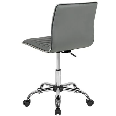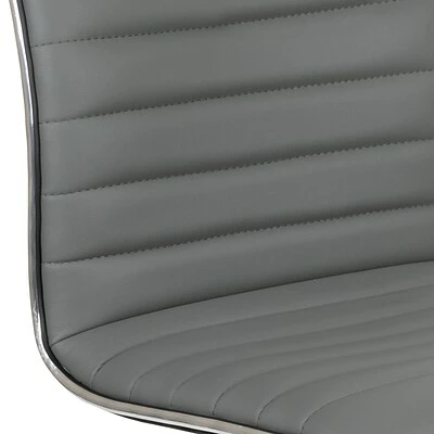 Modern accents and a sleek profile make this ribbed office task chair a perfect addition to your office. A streamlined silhouette combined with the armless design can breathe new life into a small workspace and not only allows room for more board members, clients or visitors but also permits you to roll further under a desk or table. The glossy light gray vinyl upholstery with a chrome metal border paired with a matching chrome frame and base gives an up-market feel to any professional space. The low back design and foam molded seat and back provide lower back support. A pneumatic seat height adjustment lever lets you easily position the chair while the 360° swivel gives you access to all of your work surfaces. This sturdy task chair has a heavy duty, 5-star chrome base with dual-wheel casters. Spills clean up easily with water followed by a dry cloth.