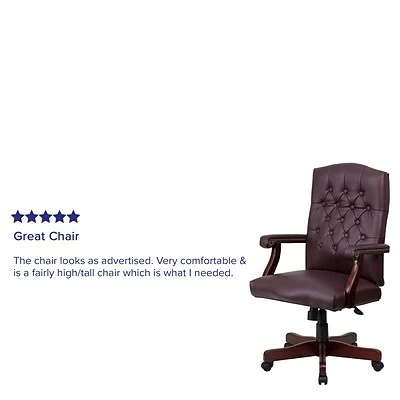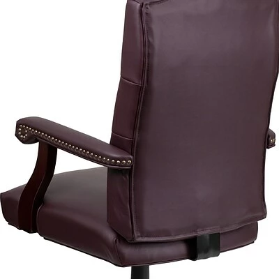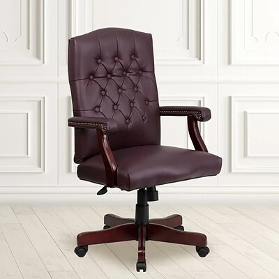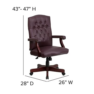 The Flash Furniture Traditional Executive Chair in an attractive burgundy shade blends with any formal and informal decor and will be the perfect addition to your office space. For extra softness and cushioning, this high-back executive chair has padded seat and back. Its pneumatic seat height adjustment mechanism lets you alter the height to attain a comfortable posture when you work or read for long hours. You can easily rotate the chair in all directions with its convenient swivel function.