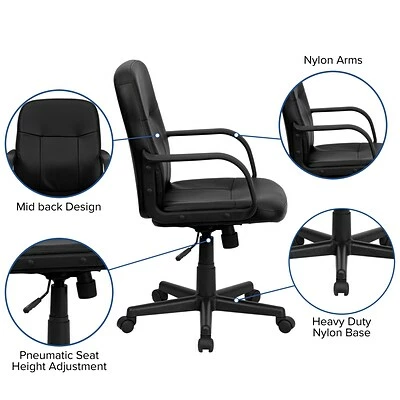 The Flash Furniture black mid-back executive chair makes health and safety a priority with its built-in lumbar support and CA117 fire-retardant foam. Its heavy-duty design features a tough nylon base and dual -wheel casters, so it’s sturdy enough for any office.All-Day Comfort