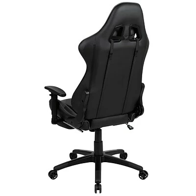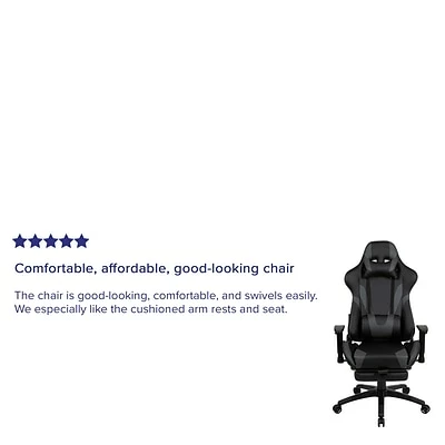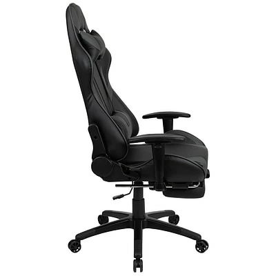 Have game day any time on your PC or with your console of choice with this gray racing gaming chair. Featuring a reclining back and slide-out footrest covered in soft and durable LeatherSoft upholstery, this high back ergonomic office chair is a must have. Adjustable headrest and lumbar pillows can be repositioned where you need them or removed. Adjustable pivot arms relieve pressure from your neck and shoulders. Slide the extended footrest out by pulling the loop then flipping the footrest up to properly elevate your feet. A separate lever reclines the back 87ยฐ ~ 145ยฐ while the lever underneath the seat controls the seat height and locks the chair in an upright position. This faux leather gaming chair cleans up easily with a solvent and water based cleaner such as foam. Complete your gaming experience with our black gaming desk with cup holder, headphone hook, and monitor/smartphone stand.