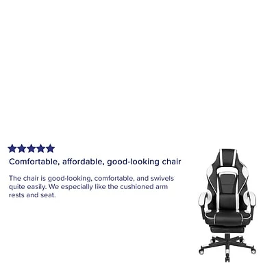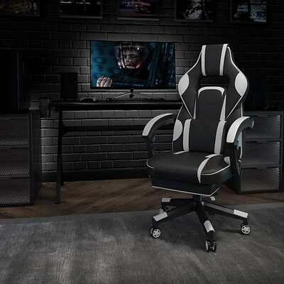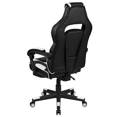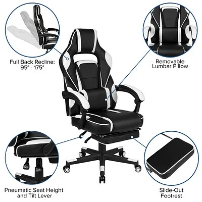 Sit back, take a deep breath and get ready to have your mind blown when you take a ride in this reclining gaming chair with massager. This cool looking two-tone game chair has a removable lumbar pillow to support your lower back and massage those tense muscles when you plug in the attached 3 ft. USB cord. When you need a breather, recline this high back chair 95° ~ 175°. The arms actually recline along with the back to keep you comfortable. Pull the loop to slide out the footrest, flip it up and take a quick power nap to recharge. Video game chairs are designed specifically for a gamers comfort, but this ergonomic office chair is perfect for work from home use. Get the ultimate gaming experience when you add our black gaming desk with cup holder, headphone hook, and monitor/smartphone stand.