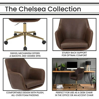 Add a modern flair to your office space with the Chelsea office chair from Hanover. The modern design with plush, all-over foam padding gives the user a chic and stylish appearance while providing optimal comfort. The golden base stands securely in place while offering a smooth 360-degree spin and effortless seat adjustments. The Chelsea design can be used outside of the office as well. Its solid, faux leather tone integrates seamlessly into most color schemes and works as a nice accent chair that will bring modern vibes to any living room, kitchen, and lounge space. Professionalism, comfort, and style come together perfectly with this trendy office chair from Hanover.