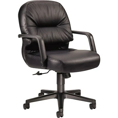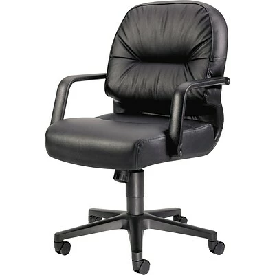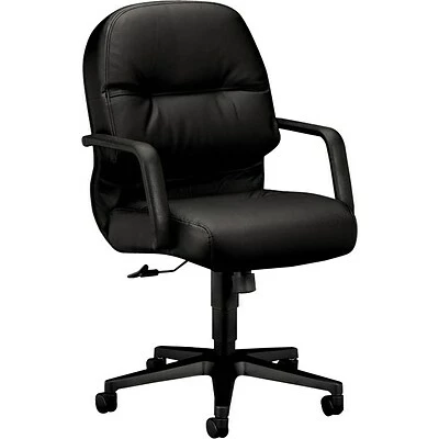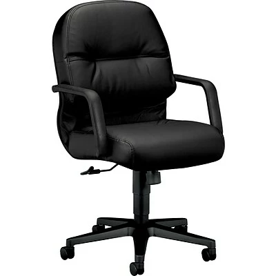 The HON pillow-soft executive chair in black is made of durable leather and is ideal for office desks. This chair measures 41.75 x 26.25 x 28.75 inches and has a back cushion that combines both foam and a layer of polyester fiberfill to support your spine.
