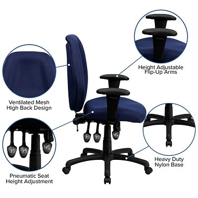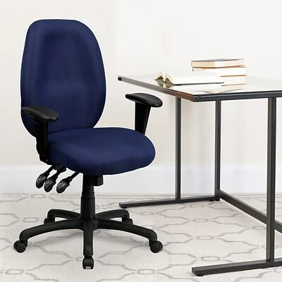 With three conveniently located levers under the seat, the Flash Furniture navy high-back fabric task chair lets users quickly adjust the seat height, seat tilt and back angle for proper ergonomic positioning. The contoured back and seat are filled with high-density foam that helps support the back and hips. Adjustable T-shaped armrests can be moved up or down.