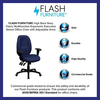 Rated up to 250 pounds, the Flash Furniture navy high-back fabric task chair meets or exceeds all ANSI/BIFMA standards