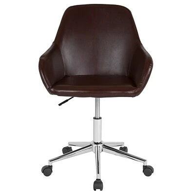 Reminiscent of an earlier time, the classic style of this bucket type task chair will always be popular. This chair boasts stylish integrated flared arms and brown LeatherSoft upholstery. LeatherSoft is leather and polyurethane for added softness and durability. This chair is ideal for those who spend the bulk of their day seated because of the mid back support that it offers to the mid to upper back region. Chair rotates 360 degrees to provide easy access to all of your work surfaces. A pneumatic seat height adjustment lever lets you easily position the chair at a height that is most comfortable for you. The chrome base provides a modern finish to this sophisticated versatile home or office chair. This retro-modern office chair is a great choice to complete the look in any office, reception, conference room or home office.