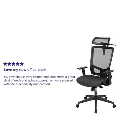 Improve productivity with a high back mesh office chair offering comfort and character to your home office or professional office. A fully transparent mesh office chair circulates air to both your back and underside. Falling articles are reduced with a coat hanger hook for convenient retrieval. Don’t be uncomfortable another workday with a synchro-tilt chair that reclines at a 2-to-1 ratio to keep your feet relatively level with the floor while reclining. The ratchet height adjustable headrest also includes a full pivot range of motion to customize to your desired positioning. The chair locks in 3 positions to lock in your reclined and working positions, adjust the rocking motion by turning the knob underneath the seat. Backed by generous lumbar support and a waterfall edge that relieves pressure from the backs of your legs, this mesh back swivel ergonomic task office chair will exceed your needs.