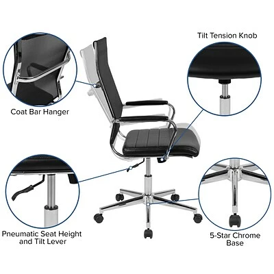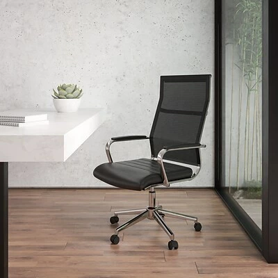 Breathe new life into your office space with mesh office chairs, whether it be your satellite office or main office. The LeatherSoft seat offers a robust ribbed design. Impressive chrome arms with a padded layer provide support to your upper body while looking exquisite. Deliver successful meetings and presentations as guests sit comfortably on these mid-back mesh conference chairs. Have visitors drape their suit jacket over the coat hanger bar to prevent from falling. Modify the seat height by utilizing the lever underneath the seat that also locks the chair in an upright position. When you want to lean back pull the lever out and use the knob to adjust the force that’ll be required to recline. Don’t allow the stresses of the day get to you, keep yourself tranquil with a mesh back office chair. The mesh material allow air to effectively circulate to your back.