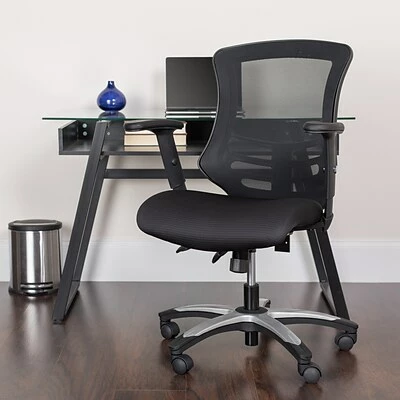 This swivel ergonomic office chair was built to maximize your comfort with its triple paddle functions while sporting a stylish black and silver 5-star base. Achieve comfort with the ergonomically designed molded foam seat. The transparent mesh back allows air to circulate to keep you cool. Built-in lumbar support helps prevent back strain and you can adjust the back height a full 2″ up and down. Easily adjust the back angle, seat height and tilt angle using three paddle mechanisms conveniently located under the seat. The locking back angle adjustment lever changes the angle of your torso to reduce disc pressure. Turn the tilt tension adjustment knob to increase or decrease the amount of force needed to rock or recline. Lock the seat in place with the tilt lock mechanism. When in need of a workhorse, this High Back Black Mesh Multifunction Executive Swivel Chair with Molded Foam Seat and Adjustable Arms will deliver results.