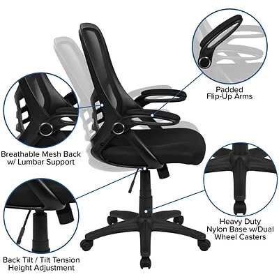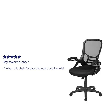 Fall into comfort on this ultra-padded swivel office chair that’ll add personality to your office space. Put that old chair to rest, having the support of an ergonomic office chair will help improve your attitude when you no longer must sit in discomfort. This modern office chair is equipped with a lever to control the seat height and activates the seat recline. Mesh office chairs allow air to circulate to your back, keeping you cool. Paired with a contoured padded seat and a high back this executive office chair will integrate into any space. If you like working with your chair raised high, flip the arms upward which allow you to pull yourself closer to your desk. You’ll have no problem taking charge of your workday perched on this high back ergonomic office chair with flip-up arms. You’ll wish you had purchased this chair sooner, for yourself or your staff.
