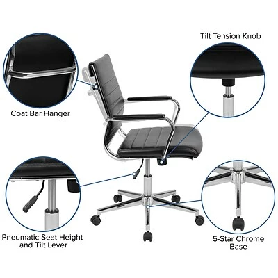 Revive your business offices with fresh paint, contemporary light fixtures, and this ribbed office chair for every office and cubicle. Fall into comfort with the ribbed back desk chair backed by curved lumbar support. An integrated back bar to hang garments such as coats and jackets. Take the pressure off your upper body with the integrated padded arms. Adjust the chair to your desired height by utilizing the lever underneath the seat that also locks the chair in an upright position. When you want to lean back pull the lever out and use the knob to adjust the force that’ll be required to recline. Lessen pressure from your lower legs with the waterfall seat edge which improves circulation. Redesign your hotel business center or home office with this mid-back desk chair to carry your space into the new century. Coordinate your entire office with our armless and high back versions.