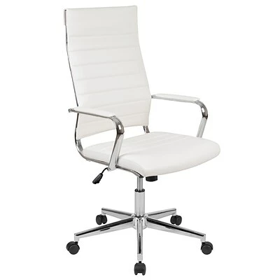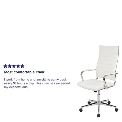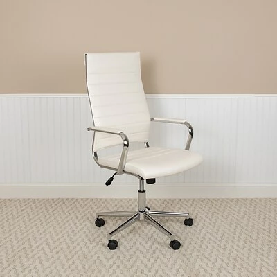 This executive swivel office chair will satisfy any office. You’ll fall into comfort with the ribbed back desk chair backed by curved lumbar support. An integrated back bar provides a convenient position to hang garments such as coats and jackets. Take the pressure off your shoulders and neck by resting your arms on the integrated padded arms that are framed by a glossy chrome finish. Adjust the chair to your desired height by utilizing the lever underneath the seat that also locks the chair in an upright position. When you want to lean back, pull the lever out and use the knob to adjust the force that will be required to recline. Lessen pressure from your lower legs with the waterfall seat edge which improves circulation. Redesign your hotel business center, meeting room or home office with this high back desk chair.