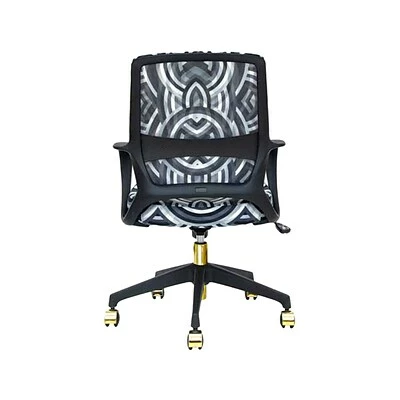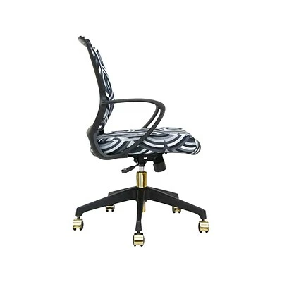 Features a patented ESC fabric upholstery in a Grayscale Echo design and a black base with gold-tone accents