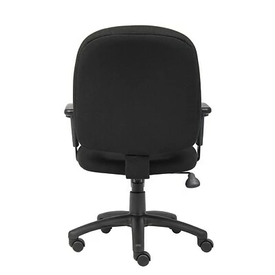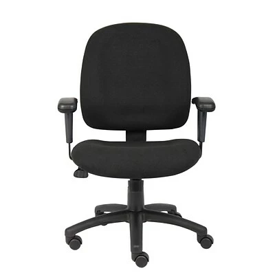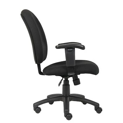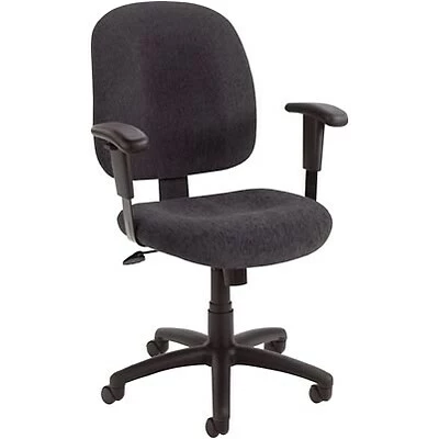 This Black Ergonomic Task Chair has contoured cushions with lumbar support. It is elegantly upholstered with Chenille fabric. The height adjustable arms provide comfortable and versatile arm rests that can suit your personal preferences. It has an upright locking position feature, providing comfortable back support. The pneumatic adjustable gas lift allows for easy seat height adjustment, to help you find the personalized sitting style that suits you and your work environment. The large 25-inch black nylon base provides added stability to the chair. The hooded double wheel casters make it easy to move and shift directions.