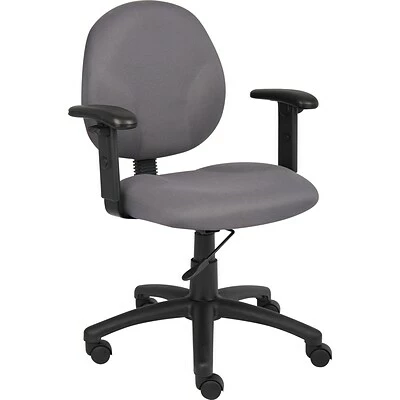 This mid back ergonomic task chair is the perfect way to increase productivity and remain comfortable while doing so. Its contoured back seat promotes proper posture that prevents back strain, while its extra large seat and back cushions ensure maximum comfort. Additional features include adjustable arms, pneumatic gas lift seat height adjustment, black Caressoft upholstery, and adjustable back height and depth. It is available in four colors, so there are plenty of options for matching your existing color scheme.