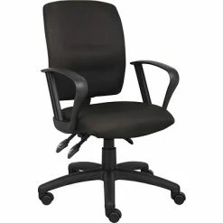 The Multi-Function Budget Task Chair is upholstered in Black Crepe fabric. It comes with an adjustable height back that can be moved to the perfect lumbar support position. The seat tilt lock allows the seat to be locked throughout the tilt range. The back angle lock allows the back to be locked throughout the angle range for perfect back support. The Loop Arms make for comfortable and natural arm rests. It has a pneumatic gas lift seat height adjustment, allowing for versatile adjustment of the seat height to suit your comfort and work environment. The large 27-inch black nylon base provides added stability to the chair. The hooded double wheel casters make it easy to move and shift directions.