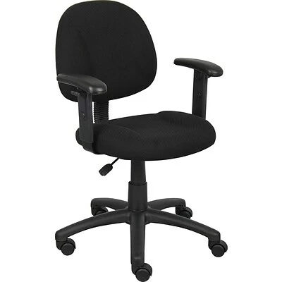 This Black Fabric Deluxe Posture Chair comes with a thick padded seat and back with built in lumbar support. It has an adjustable back depth that can be easily customized for your personal needs. The pneumatic adjustable gas lift allows for easy seat height adjustment, to help you find the personalized sitting style that suits you and your work environment. The five star nylon base allows for smooth movement and stability. The hooded double wheel casters make it easy to move and shift directions. The height adjustable arms provide comfortable and versatile arm rests that can suit your personal preferences.