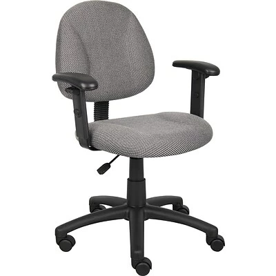 This Grey Fabric Deluxe Posture Chair comes with a thick padded seat and back with built in lumbar support. It has an adjustable back depth that can be easily customized for your personal needs. The pneumatic adjustable gas lift allows for easy seat height adjustment, to help you find the personalized sitting style that suits you and your work environment. The five star nylon base allows for smooth movement and stability. The hooded double wheel casters make it easy to move and shift directions. The height adjustable arms provide comfortable and versatile arm rests that can suit your personal preferences.