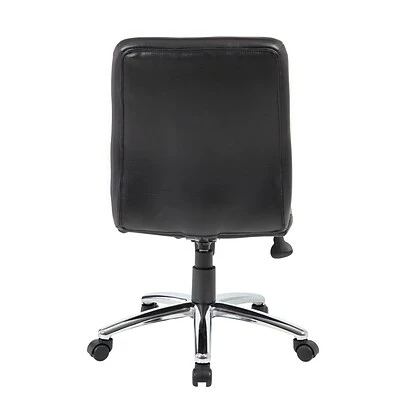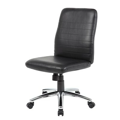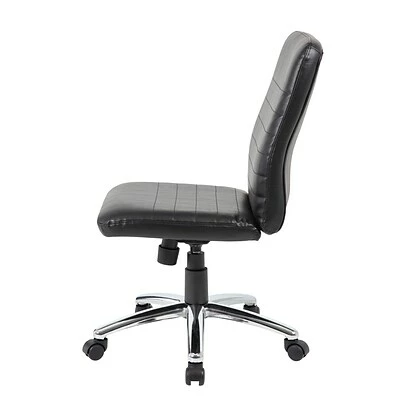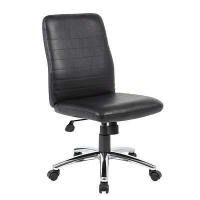 This Retro Task Chair is upholstered in Black heavy duty vinyl. It sits on a stable and stylish 25-inch Chrome base. It has an upright locking position feature, providing comfortable back support. The pneumatic adjustable gas lift allows for easy seat height adjustment, to help you find the personalized sitting style that suits you and your work environment. The adjustable tilt tension control allows you to customize the optimal angle at which you sit. The hooded double wheel casters make it easy to move and shift directions.