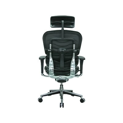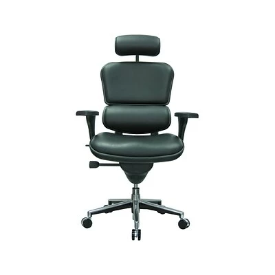 Upgrade the appeal of your office space with this Eurotech Ergohuman executive office chair. High-quality leather wraps the flexible frame for an instant upscale look, while extras including built-in lumbar support create comfort that lasts the whole day through. The padded seat, headrest and back soften the strain of the day, and pneumatic seat-height adjustment matches the height of your desk. Use the pivoting arm rests to keep your arms positioned properly whether typing, writing or simply chatting on the phone. Roll into the conference room in this Eurotech Ergohuman executive office chair, which boasts a stable five-star base and dual-caster wheels.
