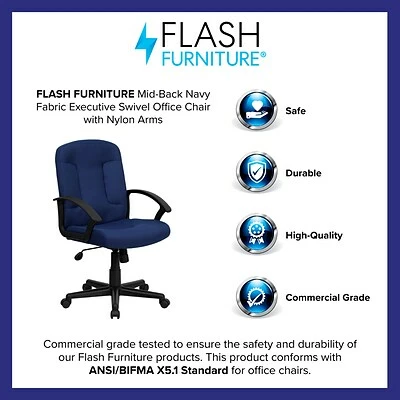 Give employees the ergonomic support they need during long workdays and overtime shifts with this Flash Furniture navy blue computer chair. Its mid-back design offers support to mid-to-upper back region for the diverse body types in your office, and the contoured seat is padded to relieve stress on the pressure points. Fixed nylon arms give the forearms and elbows a place to rest to keep should and neck fatigue to a minimum.
