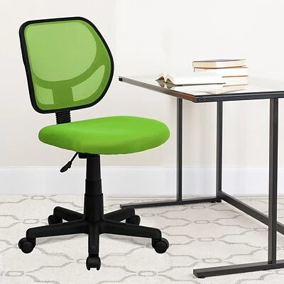 The Flash Furniture Mesh Mid-Back Armless Task Chair provides versatile, ergonomic support while you work. Offering support for the mid-to-upper back, this office chair also helps encourage good posture with pneumatic seat-height adjustment. Both the ba ck and the two-inch-thick padded seat feature breathable mesh upholstery for your comfort. Dual-wheel casters and an armless design help this chair fit into any workstation setup. The chair’s sturdy nylon base supports up to 250 pounds.