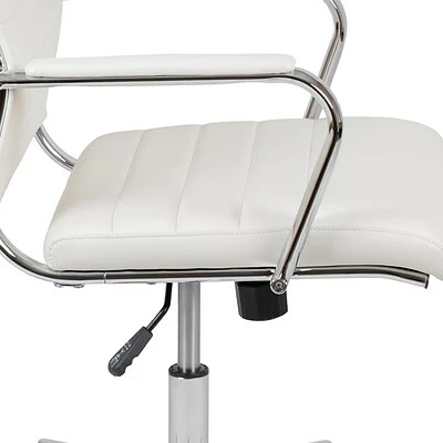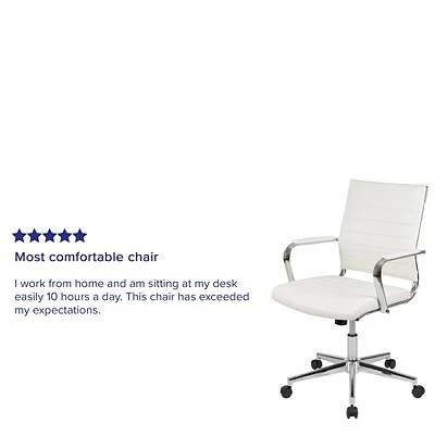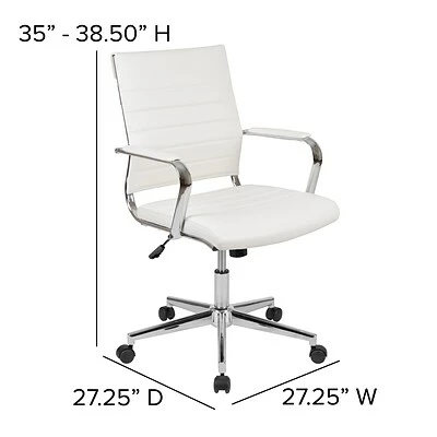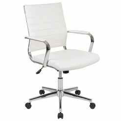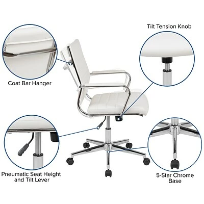 This ribbed office chair will revive every office and cubicle. You’ll fall into comfort with the ribbed-back desk chair featuring curved lumbar support. An integrated back bar provides a convenient position to hang garments such as coats and jackets. Take the pressure off your shoulders and neck by resting your arms on the integrated padded arms that are framed by a glossy chrome finish. Adjust the chair to your desired height by utilizing the lever underneath the seat that also locks the chair in an upright position. When you want to lean back, pull the lever out and use the knob to adjust the force that’ll be required to recline. Lessen pressure from your lower legs with the waterfall seat edge which improves circulation. Redesign your hotel business center, meeting room or home office with this mid-back desk chair.