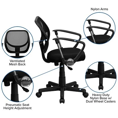 Thanks to its 2-inch padded seat, breathable fabric mesh upholstery, and pneumatic seat adjustment, this Flash Furniture mid-back task chair makes working long hours more comfortable. Its heavy-duty nylon base offers sturdy support for up to 250 pounds, and its dual-wheel carpet casters ensure easy movement around your work area.