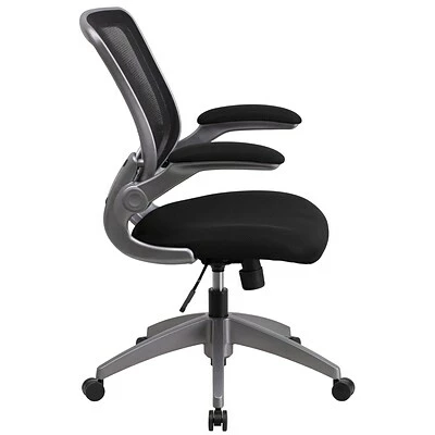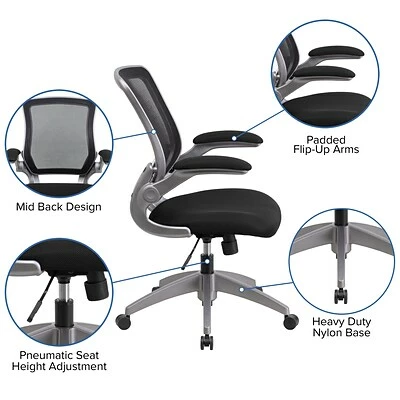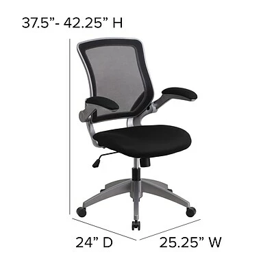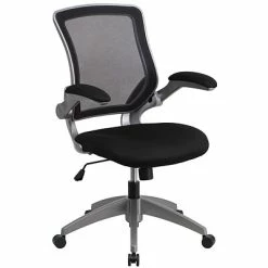 Experience the comfort of this chair that features padded armrests, breathable lightweight mesh backing and a foam seat. The flip-up armrests easily position out of the way to provide extra space, making this chair suitable for a variety of workspaces. This chair has a full swivel capability and can be conveniently adjusted while seated. Equipped with a waterfall seat design, this chair encourages good posture and helps to eliminate lower back pain. The tilt-lock mechanism allows this Flash Furniture mesh task chair to move between a seated and reclined positions easily.